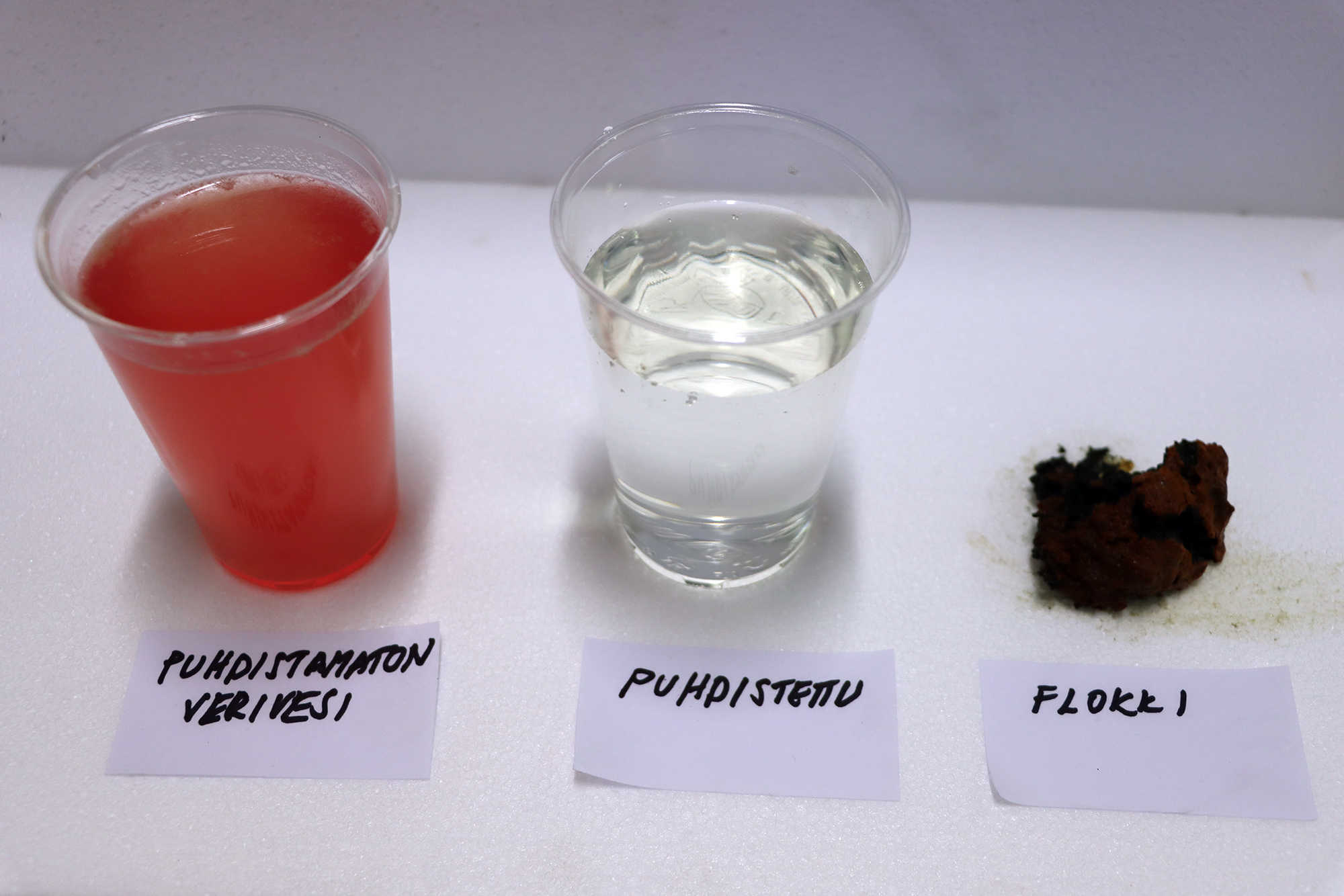 Kalojen perkuun pesuveden puhdistusprosessi havainnollistettuna. Kiintoaineet ja ravinteet sitoutuvat oikealla näkyvään flokkiin, joka kuivuu itsestään ilmassa olevan hapen vaikutuksesta. Puhdistettu vesi voidaan viemäröidä tai kierrättää.