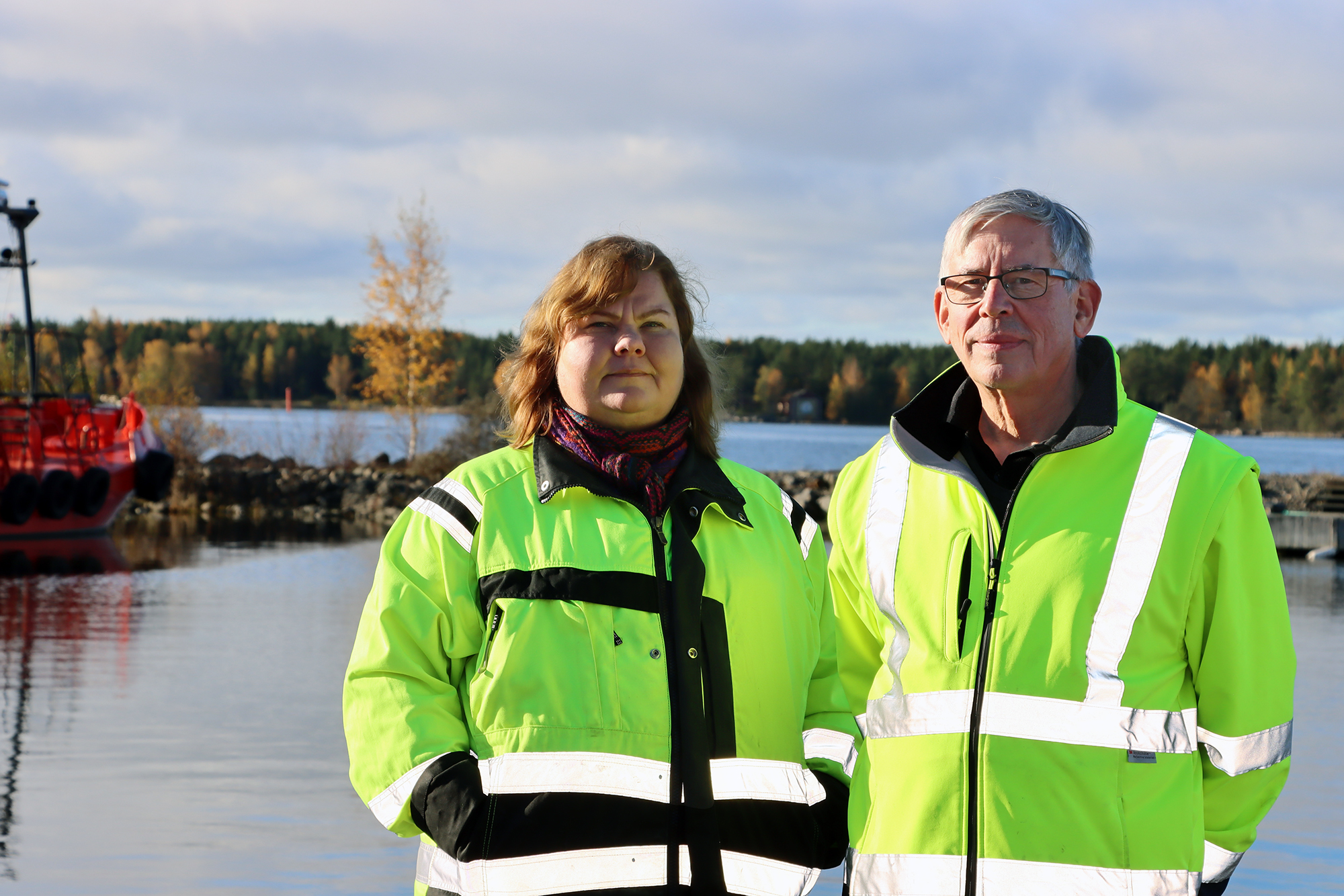 Flocon Technologies Oy:n toimitusjohtaja Sirkku Rönkä ja hallituksen puheenjohtaja Mikael Åbacka Kaskisten satamassa.