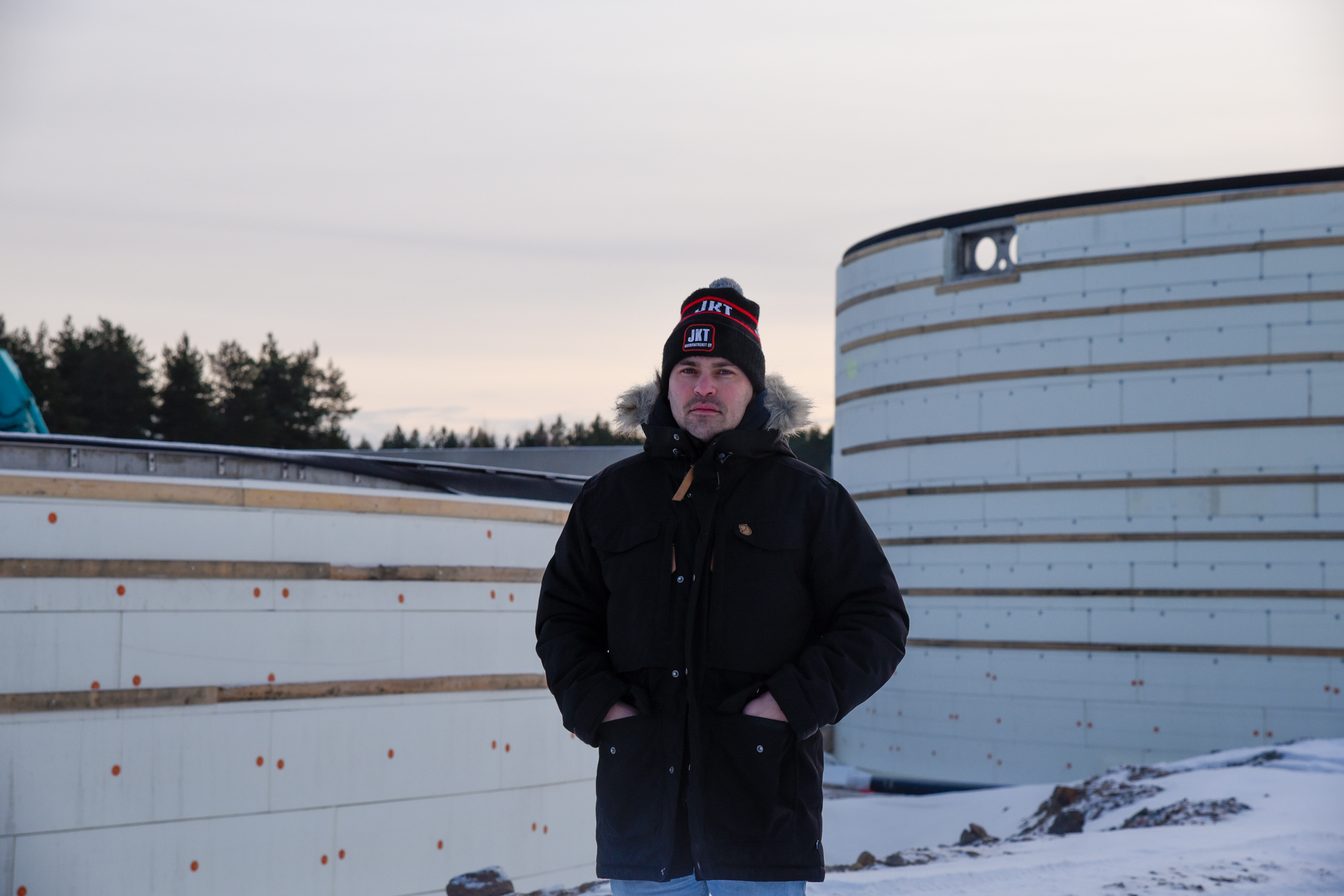 Pohjolan Peruna Oy:n tehtaanjohtaja Erkki Pisilä. Takana marraskuussa 2023 kuvattu rakenteilla oleva biokaasulaitos, joka korvaa tehtaalla noin 600 000 litraa polttoöljyä vuodessa.