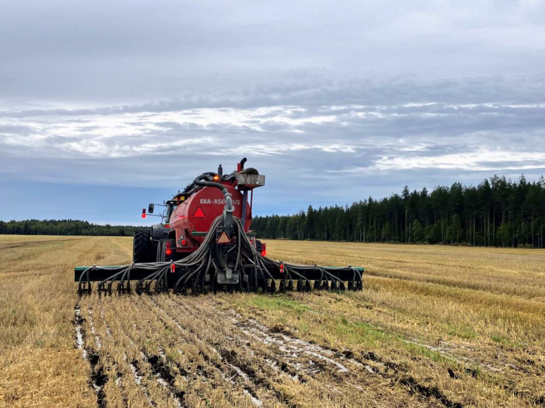 Tärkkelyslietteen syyslevitys multaavalla kiekkolevittimellä Luomu Ralta -hankkeessa, joka toteutettiin vuosina 2020–2022. Kuva: Pohjolan Peruna